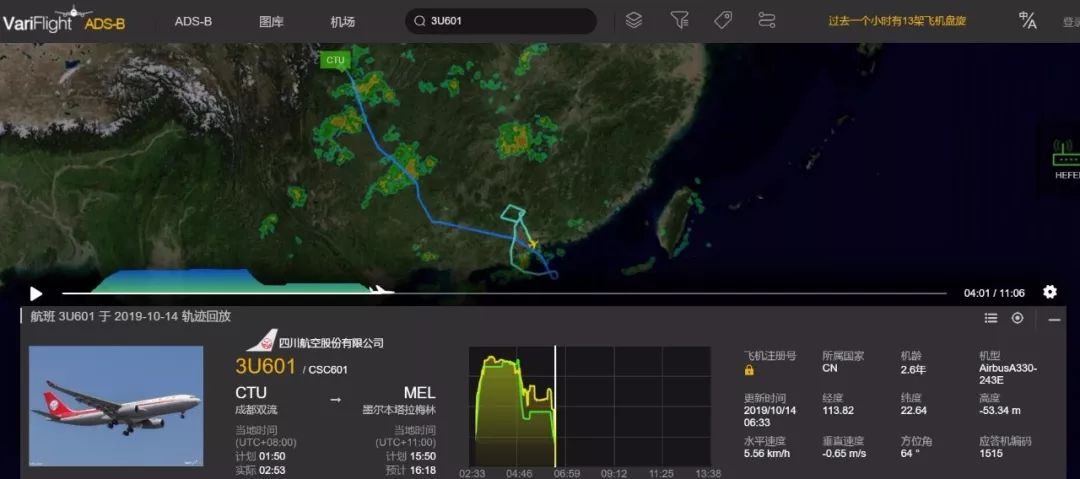 图:3U601航班飞行轨迹 图片来源:飞常准