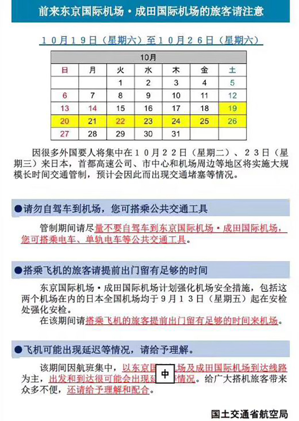 通知特别提醒,请留出充足的时间前往机场,9月13日起,两座机场都已加强安全措施,强化安检;请理解飞机晚点等情况,期间由于航班较集中,以东京国际机场及成田国际机场起降线路为中心,许多起降航班可能发生延误。
