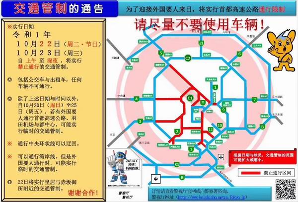 近日,日本国土交通省发布通知,10月19日至26日期间,前往东京国际机场及成田国际机场时,请使用电车、单轨电车等公共交通工具。由于参与德仁天皇即位典礼的外国要人等重要来宾集中在22日和23日抵达日本,因此,这两天首都高速公路、皇居、赤坂御所、机场周围等区域会实施大规模、长时间的交通限制,私家车、公交车和出租车等任何车辆不可通行。
