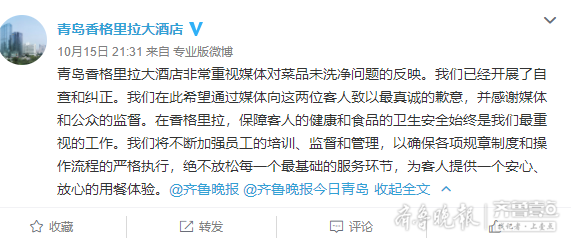 15日晚,青岛香格里拉大酒店在官方微博称,非常重视媒体对菜品未洗净问题的反映,已经开展了自查和纠正,在此希望通过媒体向这两位客人致以最真诚的歉意。