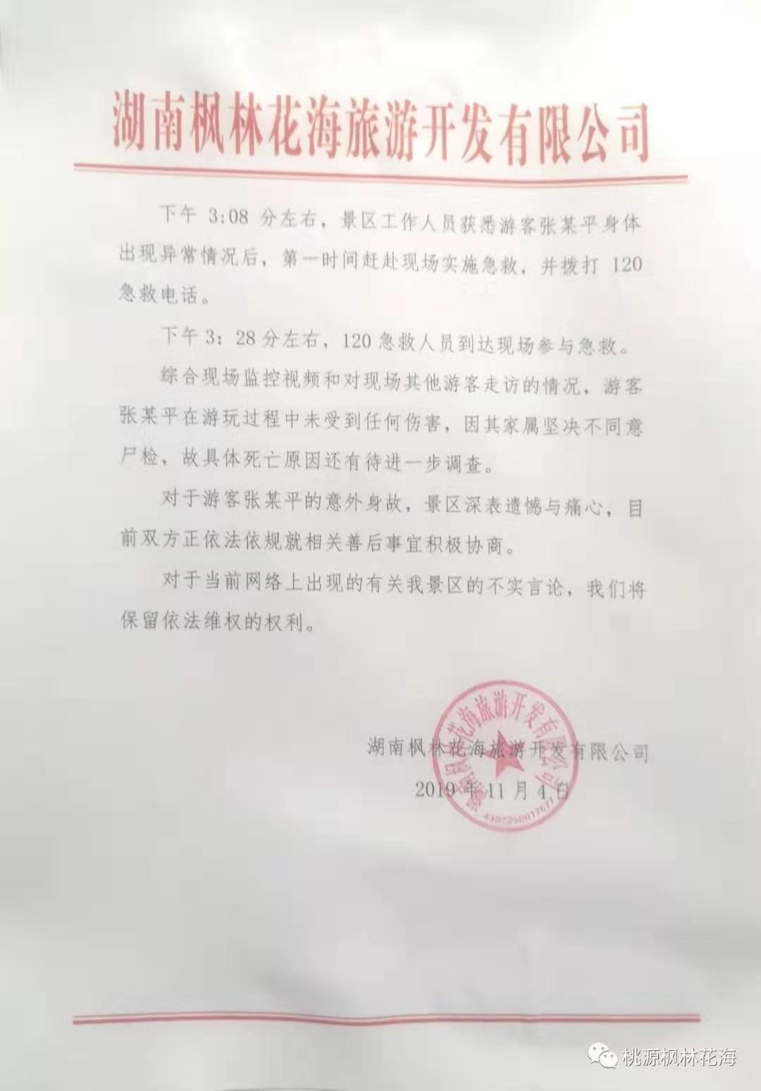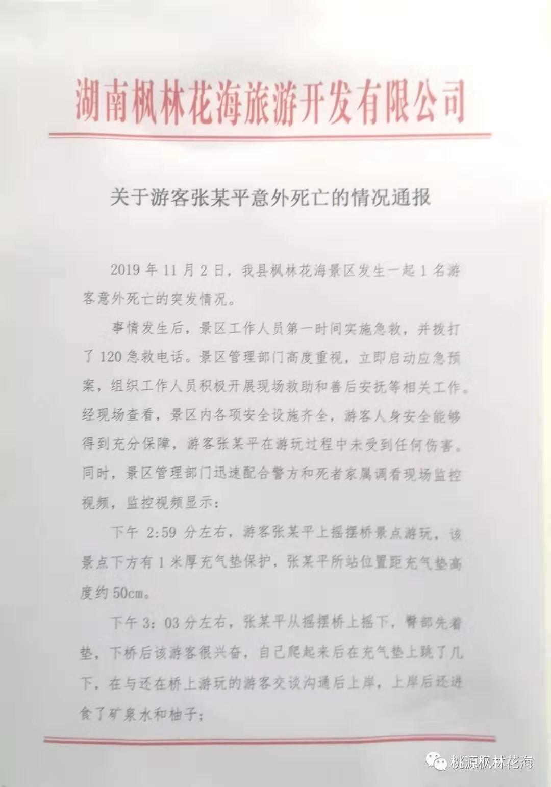 桃源枫林花海微信公众号4日针对“游客张某平意外死亡的情况”发布通报称,根据11月2日的监控视频显示: