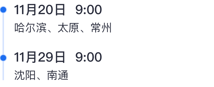 由此,滴滴顺风车的上线节奏为:11月20日上午 9:00起,在哈尔滨、太原、常州上线,11月29日上午 9:00起,在沈阳、南通上线。