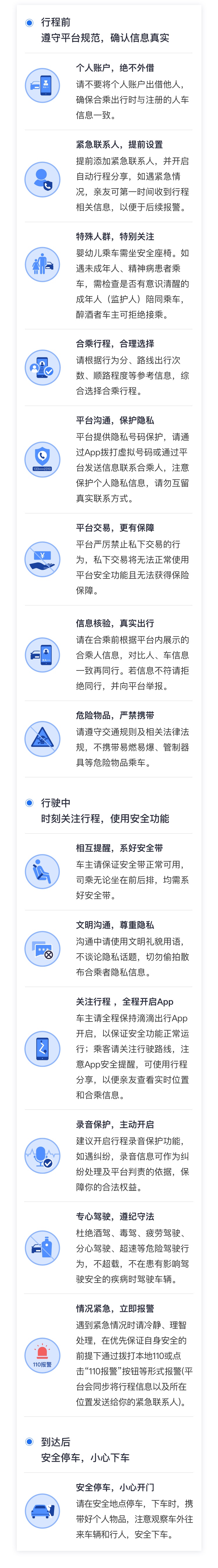 我们将不断努力优化完善产品,同时也希望大家能加强自我安全意识,希望每位用户在使用顺风车的过程中,利用好平台提供的安全功能提升合乘的安全性,与我们一起守护出行安全。