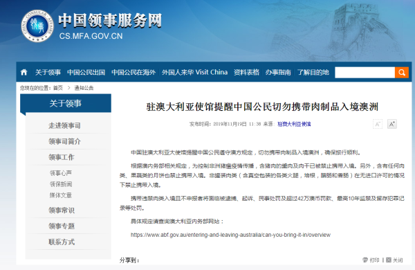 “领事直通车”微信公号11月20日消息,中国驻澳大利亚大使馆提醒中国公民遵守澳方规定,切勿携带肉制品入境澳洲,确保旅行顺利。
