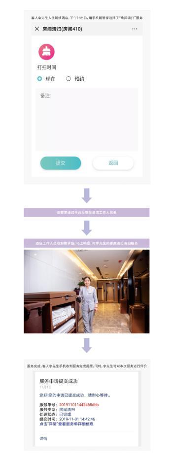 便捷化,是麗管家的一大特点。入住的客人只需在手机上打开麗管家,即可全面一览酒店服务,而只需轻轻一按,需求即刻通过平台反馈,传达至酒店工作人员处,包含房间清扫、添加物品、物品维修、闪电退房等服务