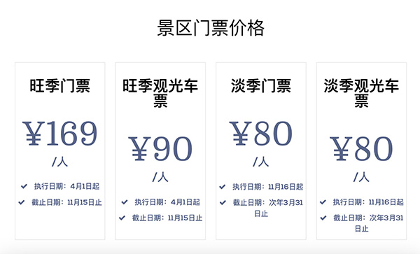 值得注意的是,九寨沟景区门票淡季和旺季的价格相差很大,根据官网,旺季(4月1日至11月15日)门票169元/人,淡季(11月16日至次年3月31日)门票80元/人,超过半价折扣;旺季车票90元/人,淡季车票80元/人。