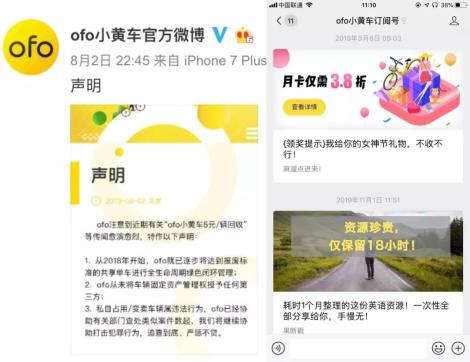 今年以来,ofo一直低调行事。官方微信“ofo小黄车订阅号”自从今年3月8日,发布“月卡仅需3.8折”的推文后,一直处于暂停更新状态,直到11月1日,推送了一条英语资源营销文章,但目前已无法查看,显示“该内容已被发布者删除”。ofo官方微博的更新,也在停留在今年8月,对单车5元/辆回收传言的声明。