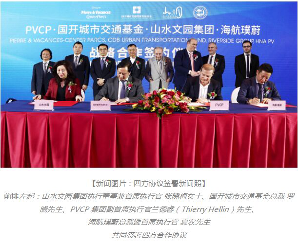 今日,山水文园集团、国开城市交通基金、法国皮埃尔度假及中心公园集团(Pierre et Vacances-Center Parcs Group,下称PVCP集团)、以及海航璞蔚旅游有限公司(下称海航璞蔚)的四方高层首脑携手共聚北京瑞吉酒店。在到场嘉宾和媒体朋友的共同见证下,四方正式签署战略合作协议,就未来长期优势互补、互惠互利的聚核商业模式达成友好共识。该协议的签署是太阳季™度假乐园(Sunparks®)与石头季™度假村(Pierre&Vacances)品牌对于全新商业模式的大胆创新,标志着太阳季度假乐园与石头季度假村品牌全面深化在华发展,为中国乡镇开发建设的解决方案注入国际领先进的开发经验并提供资深中国团队的全程管理。
