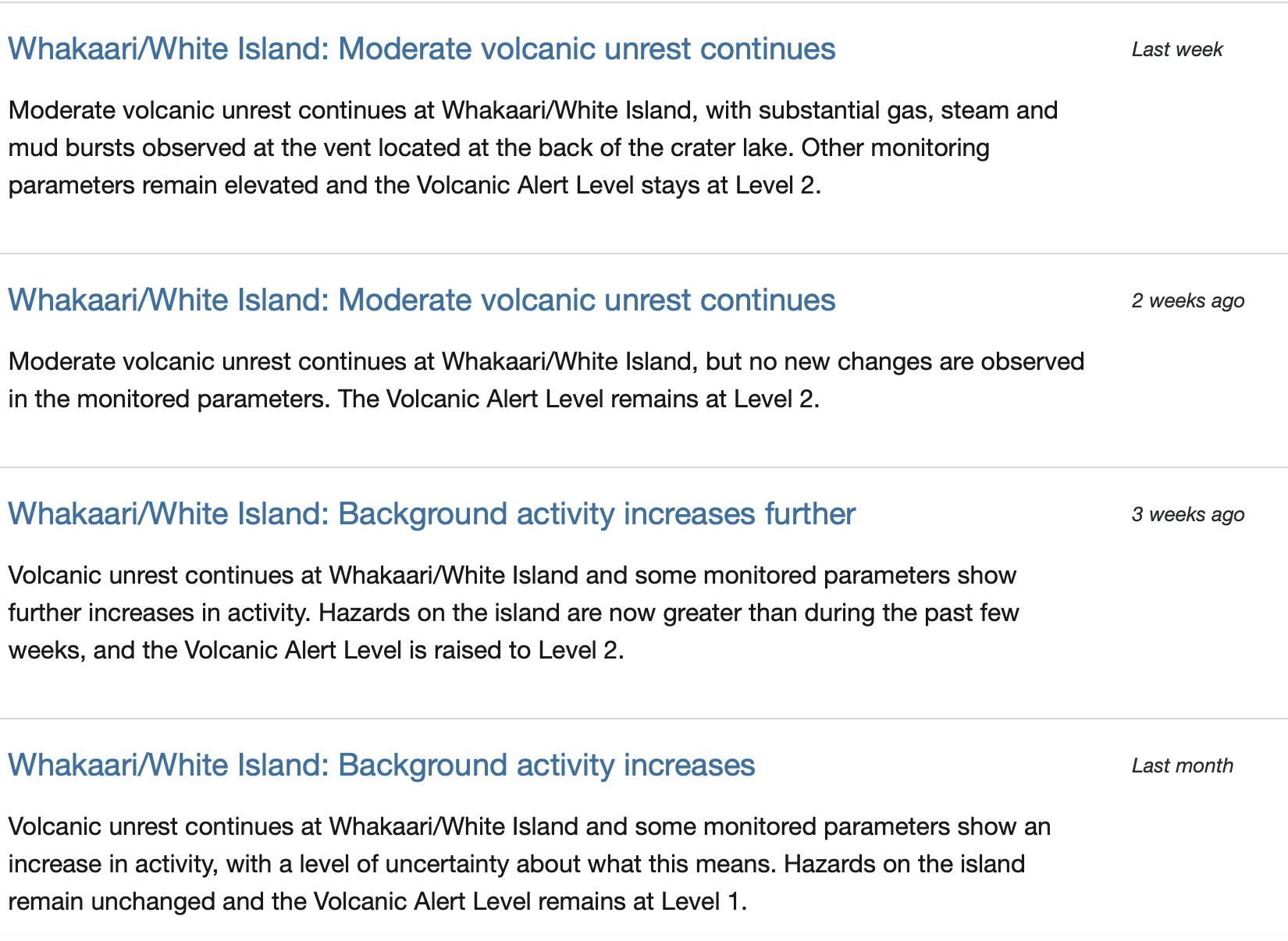 “监测结果与2011-2016年期间相似,表明怀特岛可能处于火山喷发可能性比平时高的时期”。在公布一系列数据后,GeoNet作出了如此的结论,但维持当日的火山警报为1级。