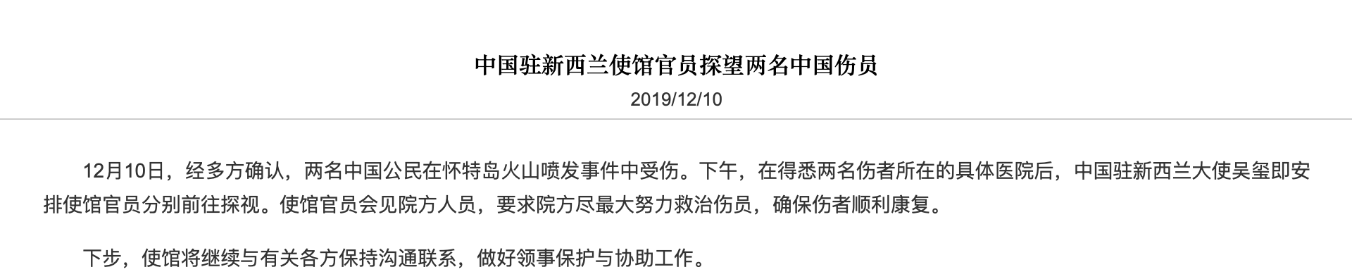 12月10日,中国驻新西兰大使馆通报称,两名中国公民在火山喷发事件中受伤。据悉,火山喷发时,有两名中国人正在火山附近。