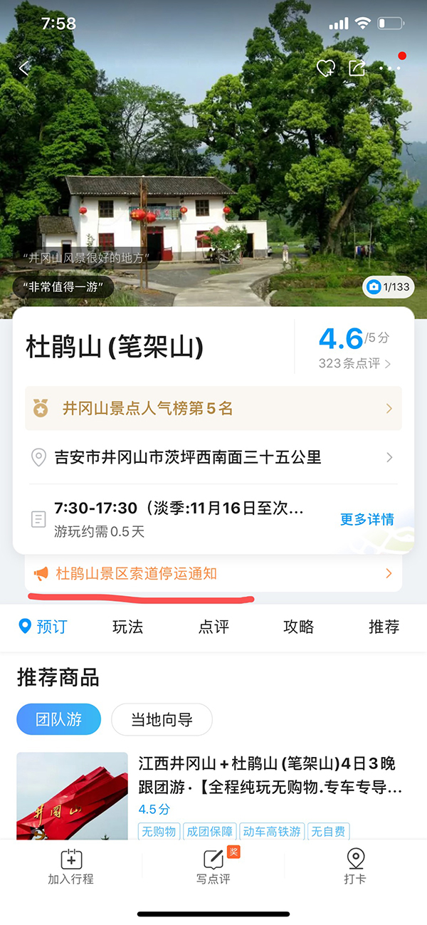 根据公告,井冈山旅游总公司称,为执行环保督察要求,江西井冈山杜鹃山景区于2019年10月28日起就已经关闭,并全面停止一切旅游经营活动。与此同时,进入杜鹃山景区唯一的交通运输工具杜鹃山索道也“被迫”停止营业。
