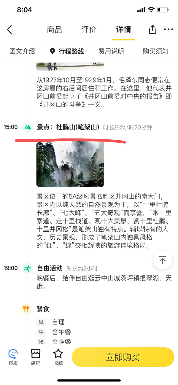 此外,澎湃新闻发现,多个的OTA平台上,包含杜鹃山景点的产品仍可购买,且对行程详情中的杜鹃山一程没有任何关于杜鹃山关停的提示。