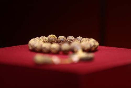 这小小的手串,它的全称叫伽南香嵌金长圆寿字纹十八子手串,每颗伽南香珠子上镶嵌小金珠组成的长“寿”字与圆“寿”字。手串背云双面镶嵌小金珠攒成的“万寿无疆”四字,坠角则镶嵌小金珠组成的抽象蝙蝠形象。香气馥郁,凸显华丽。