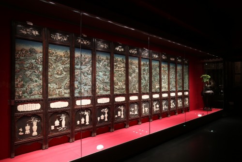 步入“盛世风华”展厅,紫檀边座雕漆三扇座屏、紫檀边座雕漆宝座率先映入眼帘。其中座屏以三扇山列式布局,紫檀木边座,屏帽、挂牙浮雕夔龙捧寿纹,紫檀木屏框内镶通景剔红锦地云蝠五龙出水图,剔红雕工精密,一丝不苟,堪为宫廷雕漆屏风的经典之作。