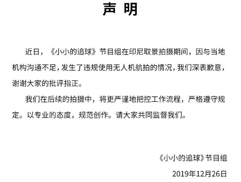 12月26日下午5点,《小小的追球》节目组再官方微博上发布声明对此道歉。声明称:“近日,《小小的追球》节目组再印尼取景拍摄期间,因与当地机构沟通不足,发生了违规使用无人机航拍的情况,我们深表歉意……”
