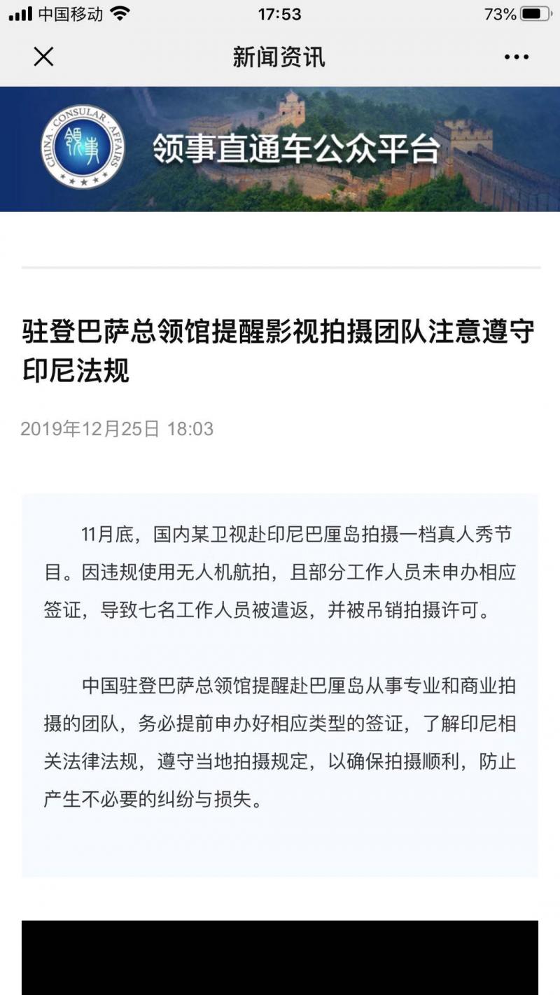 12月25日,外交部领事保护中心官方微信公众号“领事直通车”发布消息,11月底,国内某卫视赴印尼巴厘岛拍摄一档真人秀节目,因违规使用无人机航拍,且部分工作人员未申办相应签证,导致7名工作人员被遣返,并被吊销拍摄许可。据媒体了解,此节目为芒果TV制作的旅行类真人秀《小小的追球》。
