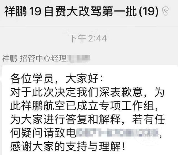 小A和其他学员获得相关信息后,觉得拖延了近8个月的招飞终于可以画上句号,但12月24日,祥鹏航空此次面向社会招收的自费飞行学员接到了祥鹏航空招飞办的电话,“由于公司计划原因,暂时不能接收2019年自费‘大改驾’了”,不再引进飞行学员,对产生的费用将在报销后转账给学员,但祥鹏航空没有说明具体会报销哪些费用。