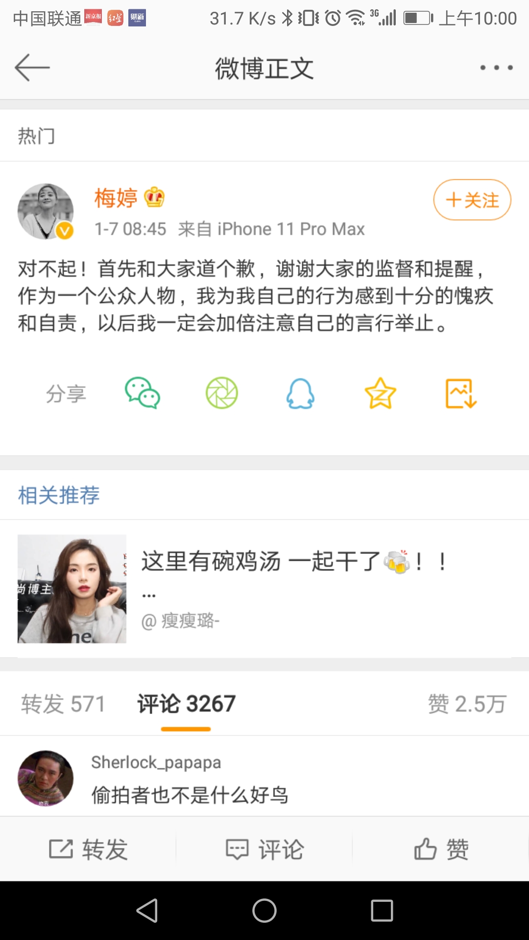 7日,梅婷在其微博发文道歉称:“对不起,首先和大家道个歉,谢谢大家的监督和提醒,作为一个公众人物,我为我自己的行为感到十分的愧疚和自责,以后我一定会加倍注意自己的言行举止。”