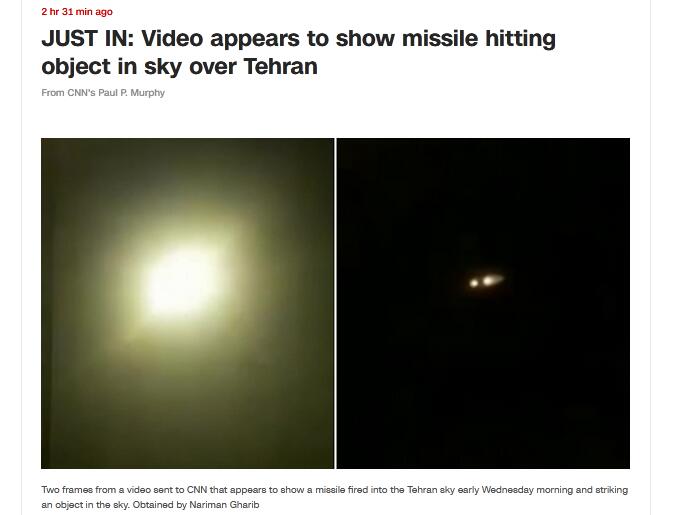 “视频似乎显示,导弹击中了德黑兰上空的一个目标。”在多家外媒纷纷报道乌克兰客机失事是因被伊朗导弹击落一事之际,美国有线电视新闻网(CNN)9日以此为题披露了一段视频,并在报道中说CNN无法证实这则视频的真实性,但视频中能够看到的建筑似乎与德黑兰帕兰德郊区的建筑相似。