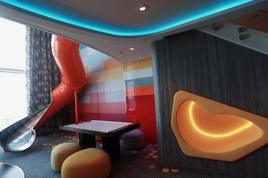 跟随引导我们顺利的来到这次旅行居住的家庭套房,据态度热情的工作人员介绍说家庭套房面积超过261㎡,包含三间独立卧室,可容纳四代同堂11人共住,还配备卡拉OK和全套环绕声设备的娱乐室,还有从卧室有直接通向客厅的超大滑梯和其他游戏设施,光在房间都可以玩上好久。是全家老少一起度假的绝佳选择。
