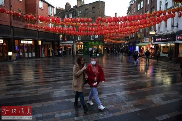 资料图片:新冠病毒导致全球多地唐人街生意萧条。图为2月13日,伦敦唐人街游客寥寥。(法新社)