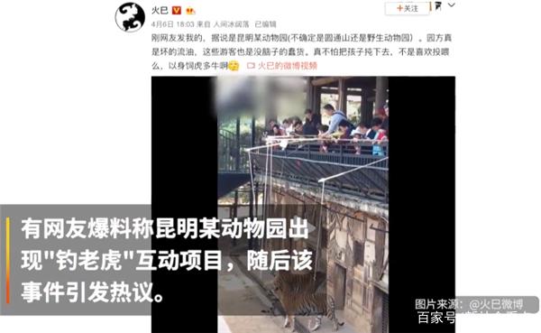 云南昆明,野生动物园,老虎观赏区,15元钓老虎。4月6日有网友在网上爆料,称昆明的某动物园内,有游客花钱玩“钓老虎”互动项目,并发文评价,“这些游客也是没脑子的星星,真不怕把孩子坉下去,不是喜欢投食么,以身饲虎多牛!”并附上一段长达十多秒的小视频。