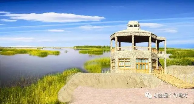 湖水碧如翡翠,这片茫茫沙漠中出现一片绿洲是非常不容易的,而且这片绿洲竟如此的美丽,让人为之惊叹。水源主要来自喀拉喀什河,由于地势低洼,大量泉水露出地面渐渐形成泉水溢出带,成为另一水源补给。