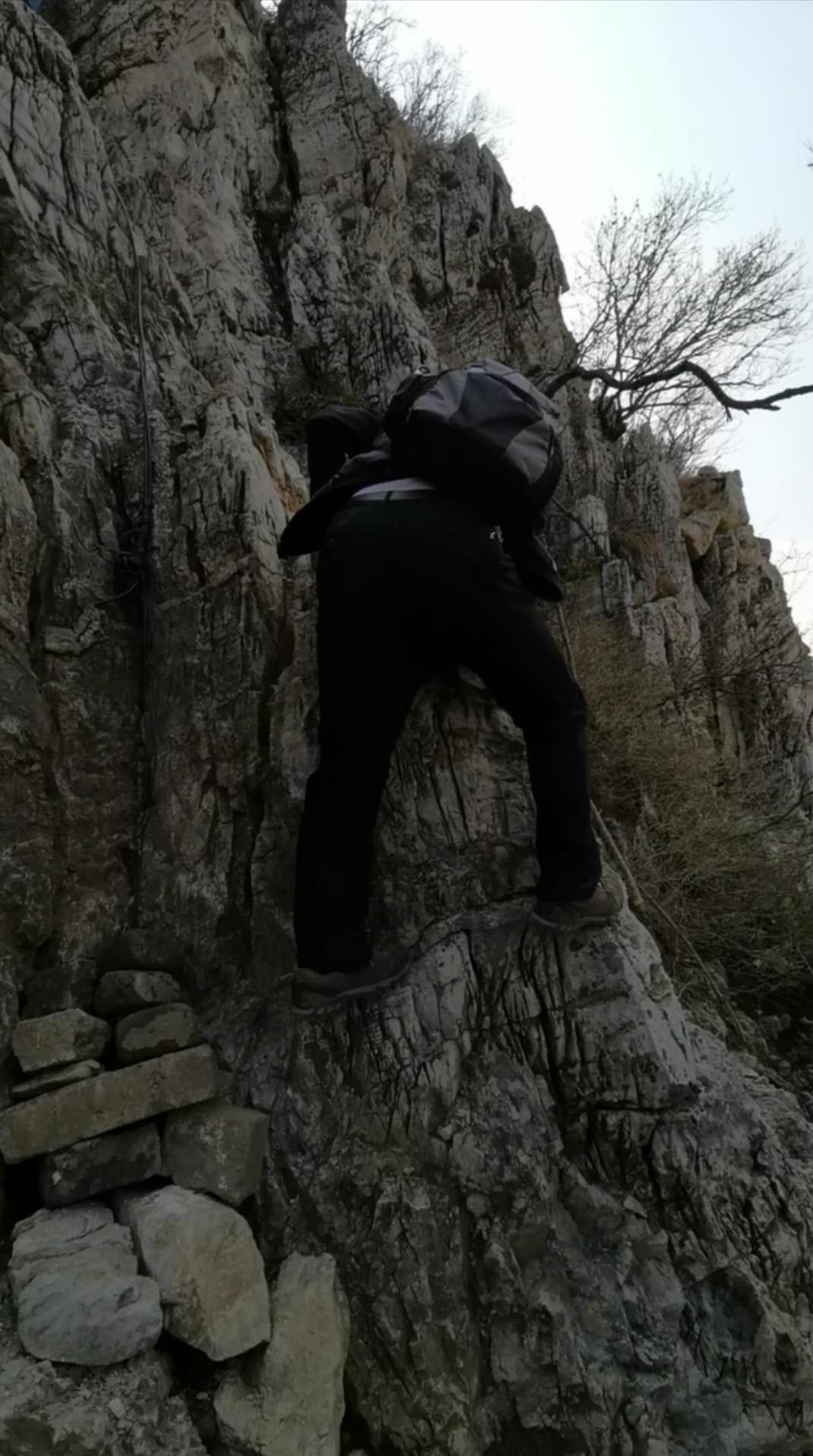 五方人员在爬西缩脖楼西侧最险段长城之一。于丽爽摄