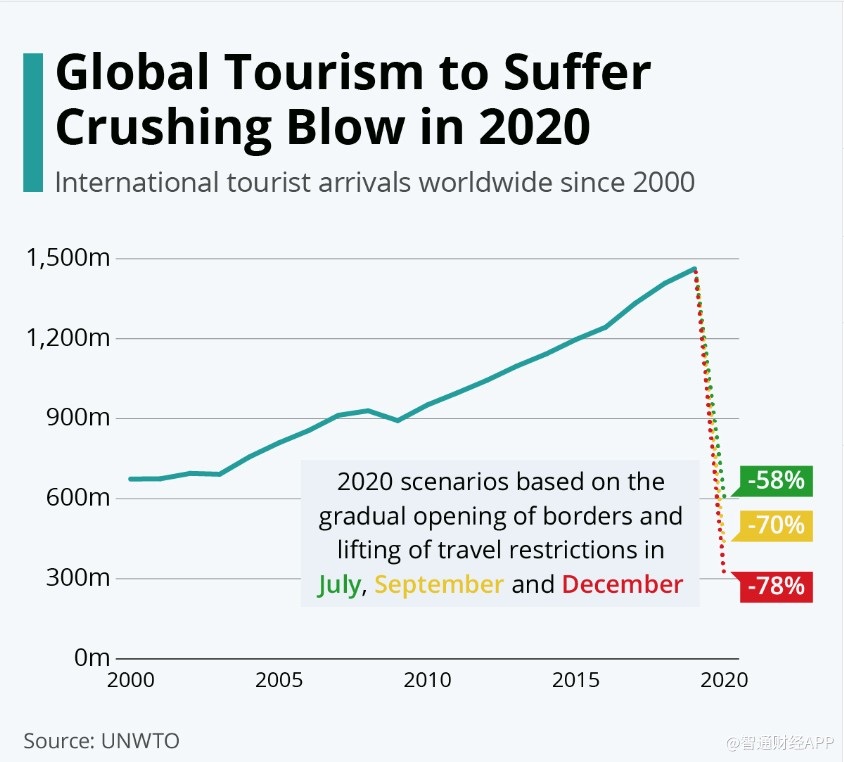 如果解除旅行限制的时间再往后拖延两个月,即9月,国际游客人数将降70%至4.4亿人。