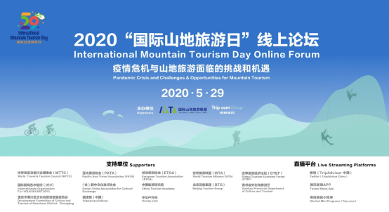 2020年5月29日是第二个“国际山地旅游日”,在新冠疫情的特殊背景下,国际山地旅游联盟与携程集团,以线上形式共同主办“疫情危机与山地旅游面临的挑战和机遇”主题论坛。本次论坛是2020开年的首场线上国际旅游论坛,旨在聚全球山地旅游业界之智,共同研讨疫情危机给山地旅游及旅游领域造成的影响,探索疫后复苏发展趋势和机遇。论坛分为“专家见解与学术视角”、“行业观点与思维碰撞”两个板块,采取主题演讲+连线讨论方式进行。本次活动得到了世界旅游及旅行业理事会(WTTC)、亚太旅游协会(PATA)、欧洲旅游协会(ETOA)、世界旅游联盟(WTA)、中国旅游研究院等单位的大力支持。