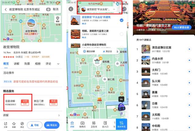 真人语音讲解功能的操作也十分简单。以故宫为例,用户在百度地图搜索"故宫"后,可在地点详情页中点击"语音讲解"进入AI导游。点击AI导游页面上方的标题栏,在弹出的列表中选择其中任一专辑播放即可。例如选择专辑"明朝、清朝两代皇宫之旅",点开就可进入收听包含"清宫卤簿仪仗展"、"内金水桥"等在内的19个子景点的讲解内容,生动回溯历史。不仅能帮用户把景区了解得透透彻彻,还可以避免因"蹭导游"而导致人群聚集,在安全游玩中升级旅游体验。
