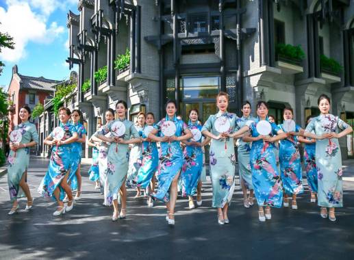 由600名与杜甫草堂、大慈寺同宗同源的非遗工匠以五大非遗工法精雕细琢而成的香洲埠,端午时节却格外隽永——由横琴新区社会事务局组织的琴澳两地居民旗袍秀,以新时代女性的飒爽英姿,为埠内的古色古香增韵不少。与过往只能欣赏古建筑的静态美不同,此番旗袍秀,将古画卷中才能欣赏到的灵动活脱脱地展现到人眼前,给过往游客传递着跨越着千年的文化传承气息。无论是穿针引线时,还是一颦一笑间,多有游客驻足观赏,仿佛一个个凭空而现的“