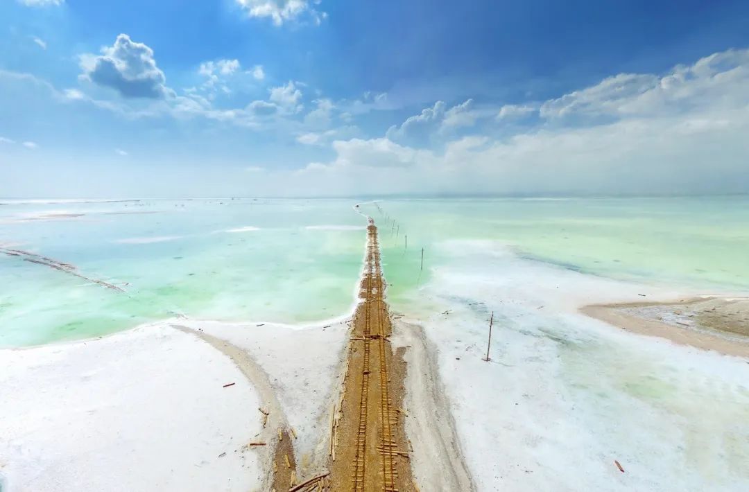 结晶的盐粒,在湖面上形成厚厚的盐盖,足以支撑起一段32千米的青藏铁路与公路。路面光滑平坦,湖光山色相映,将湖面分为两半,当路面受损时,只需浇一些卤水,路面即可复原。“钢铁彩虹”、“万丈盐桥”的奇观,与盐湖组成青藏高原上一道靓丽的风景。