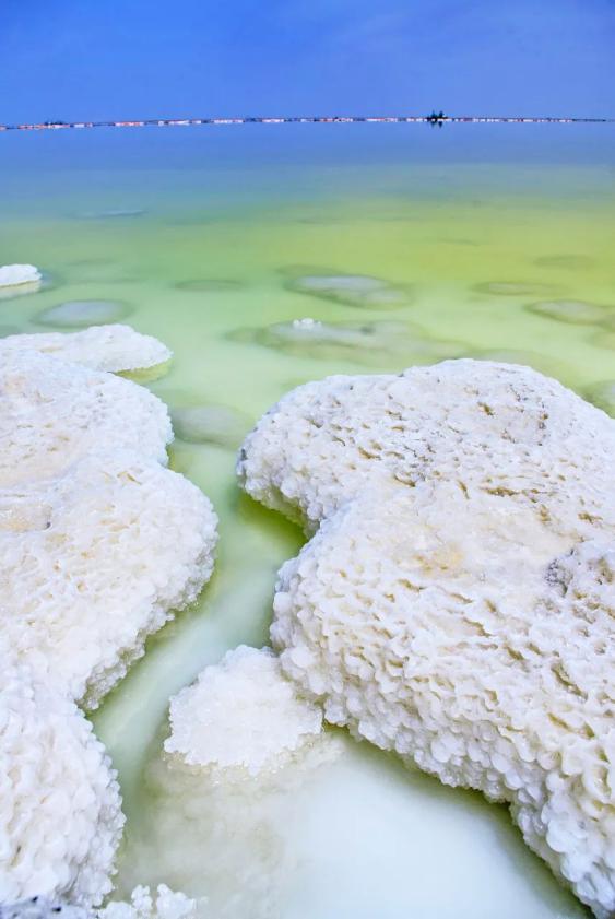 这个面积达5856平方千米的盐湖,在柴达木盆地南部长期经受风吹日晒,天长日久,练得“皮糙肉厚”。高浓度卤水中分解出锂、硼、镁等元素,结成盐钟乳,形成丰富多彩的盐喀斯特地貌。