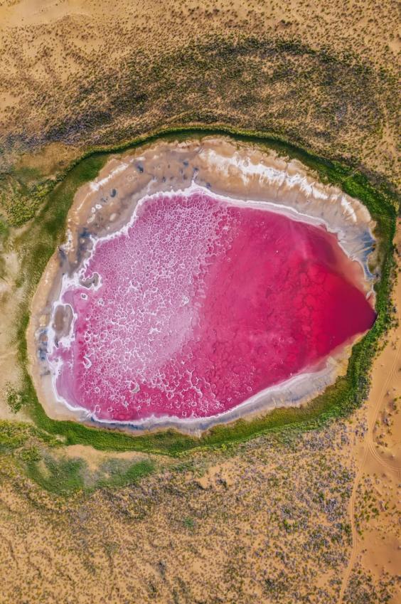 ▲ 内蒙古阿拉善巴丹吉林沙漠中的盐湖,俗称“红海子”。 图/视觉中国