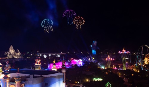 在白天的龙马巡游之后,珠海长隆海洋王国每晚还会上演“烟花星闪幻彩秀”,通过声光电打造立体全景秀。游客可以看到300架无人机在夜空中组成世纪海洋矩阵,变幻出千姿百态的海洋动物造型,带游客走进浩瀚的大海,去探索神奇奥秘的海洋。