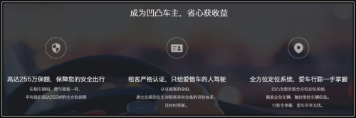 凹凸租车是在13年创立至今为止,过去了有7年的时间,品牌率先将车共享的理念带入了国内,通过平台车主可以把自己的车辆直接租给其他人使用,然后获取一定的额外收益。用户也可以租到更加实惠的车辆,双方其实都可以保证安全,因为平台可以提供价值255万的全额保险,这在行业内是比较高的,双方都可以达到一种互赢的局面。