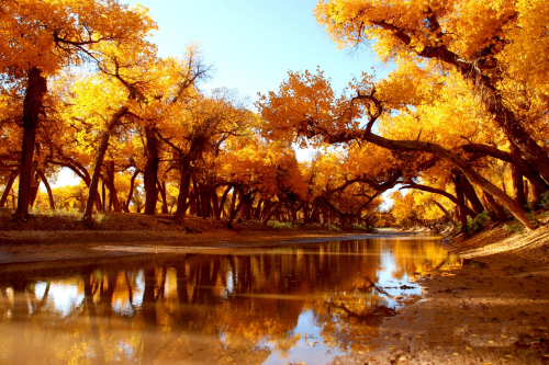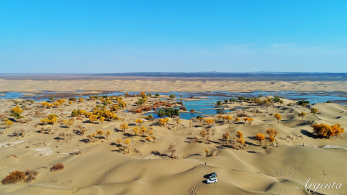 胡杨将最美的时间选在了秋天,而这个选择从一亿多年前就已经注定。是的,作为自然界最稀有的树种之一,胡杨述说的不仅是风景之美,更是生命之美。“生而千年不死,死而千年不倒,倒而千年不朽“,时间让人类的历史更迭,却成就了胡杨美丽的亘古。而在内蒙古阿拉善盟额济纳有45万亩胡杨林,是世界仅存的三大胡杨林之一。额济纳将胡杨的美丽牢牢“占有”,只在每年10月左右才“惊艳世人”。十月金秋,金秋二字也仿佛是为额济纳量身定做一般,胡杨、沙漠、湖泊...秋天似乎打碎了染色瓶,金色就这样向额济纳尽情倾泻,或许在国内再也找不到如此纯粹的“金秋”。