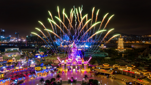 国庆期间,城堡焰火秀是绝对不容错过的一大看点。绚烂的金花以夜空为舞台,翩翩起舞洒落在星空,闪耀变幻于天穹,带来华丽的视觉盛宴。城堡上灯光变幻交织,唯美的光影邂逅绚烂的焰火,以独特的方式为祖国庆生!