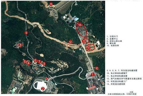 公园景区内有60多处违法建筑,其中有两栋别墅各占地约300平方米,建设时砍伐森林近6亩,推平山坡约3800平方米。另一栋别墅建筑面积约500平方米,占地面积超过2500平方米……