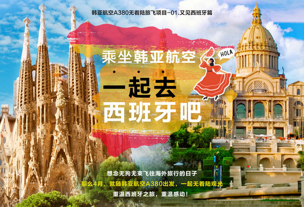 4月,韩亚航空预计将以"又见西班牙"为主题,进行3次(4月11日、17日、25日)A380无着陆旅游飞行。西班牙有着"高迪之城"、"建筑之城"、"西班牙足球圣地"的美称,其中巴塞罗那是西班牙最具代表性的旅游城市,也是深受韩国游客喜爱的旅游地。