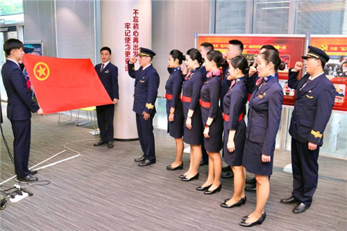 准备飞行前3个小时,整套组早早的来到公司,7点,机长朱宏坤带领机组成员们在重温入团誓词中开启了新一天的工作,“我宣誓:我志愿加入中国共产主义青年团,坚决拥护中国共产党的领导……”。
