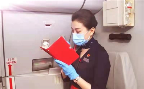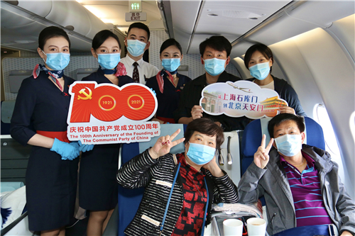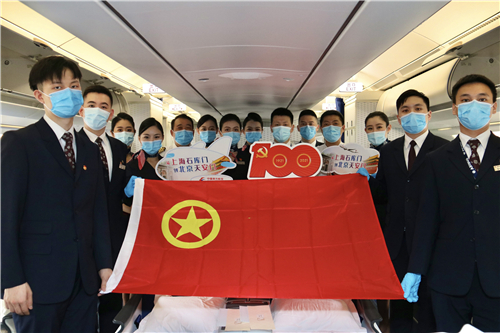 平飞后,乘务员们就投入到紧张忙碌的工作中,航程休息期间,部分旅客同乘务员一起合影,加入到“百年党旗红 护航蓝天梦”的活动中,与“中国共产党成立100周年庆祝活动标识”合影留念。