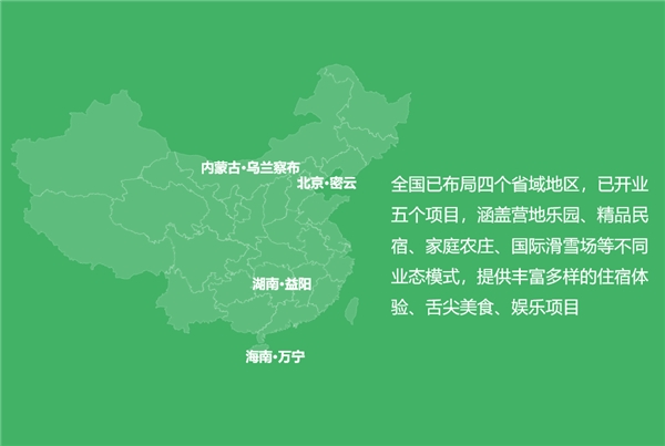 日光系营地乐园目前已覆盖北京、内蒙古、湖南、海南等地,拥有日光山谷、日光庄园、日光里的福院儿、日光草原、日光湖畔、日光海岸五个不同业态的项目,为亲子家庭、高端私享聚会、团队建设等不同客群带来多样住宿、美食及娱乐。为88日光家庭日品牌发展提供有利条件。