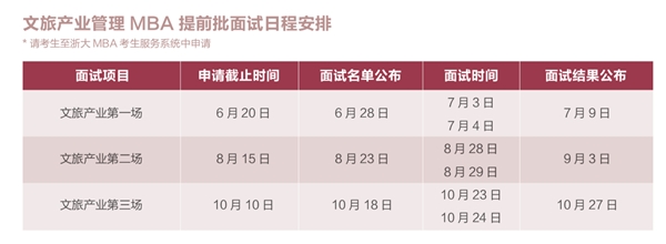 项目学制共2.5年,采用非全日制学习方式,招生分提前批和常规批两类。其中,提前批是针对工作年限较长,管理经验较丰富的考生,需要在正式报名参加MBA全国联考前向浙江大学MBA教育中心提出申请并在通过审核后参加相应的面试,具体申请和面试安排请登录浙大MBA教育中心网站查询http://mba.zju.edu.cn/2022/ (申请提前批的考生请报名文旅专场)。本次提前批学员入学时间为2022年9月。(文中图片均由浙江大学MBA中心提供)
