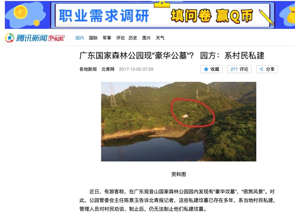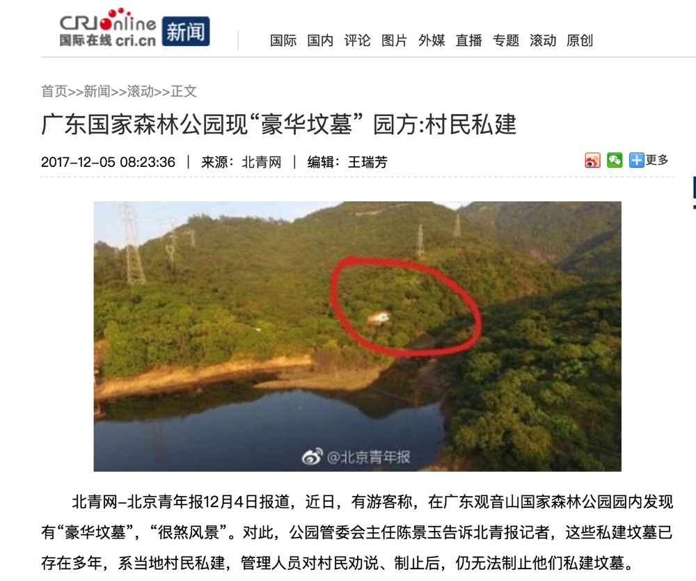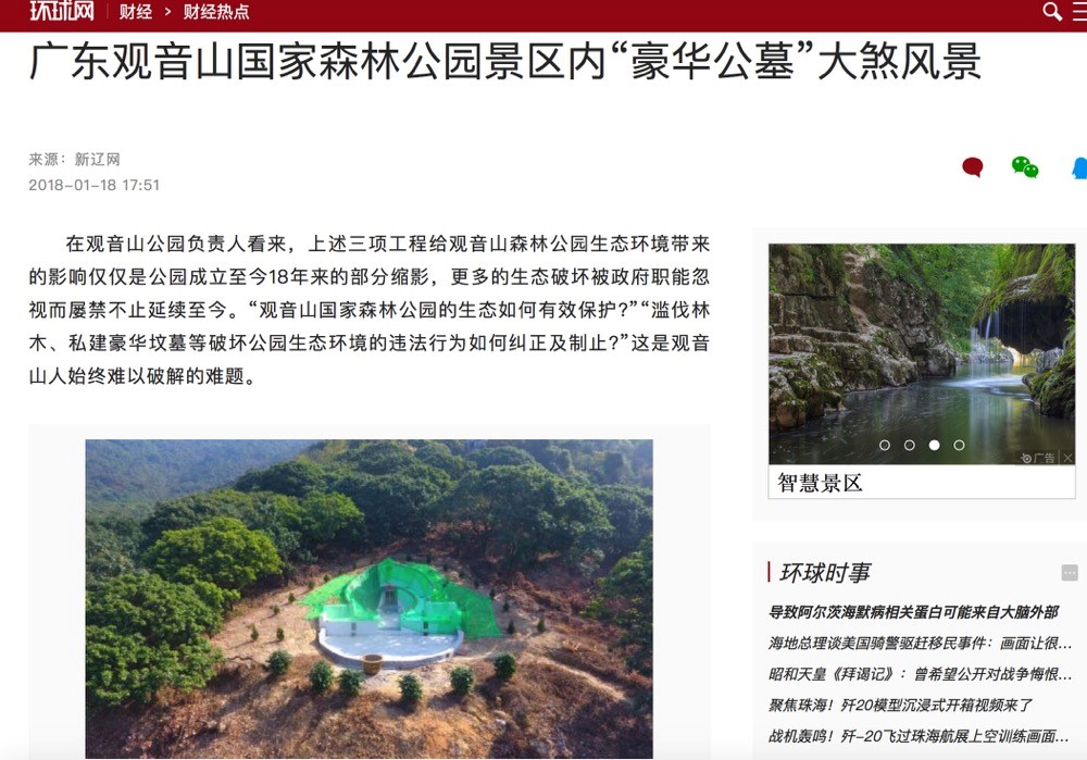 地点:东莞观音山国家森林公园;事件:附近居民多年不停违法私建“豪华坟墓”;现状:当地东莞市林业局及有关部门拖延至今仍不处理。