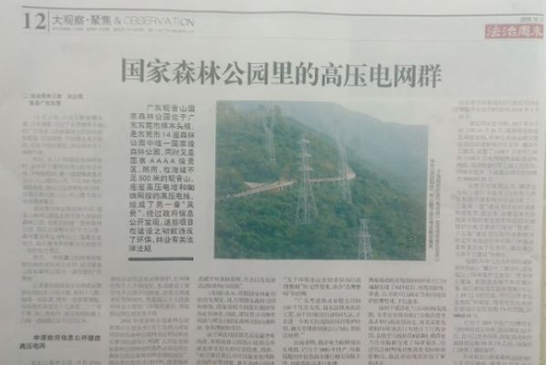 原因之二就是公园方坚决反对南方电网违反《森林保护法》,在没有取得合法手续的情况下,强行穿越国家森林公园在公园内架设7组高压线塔。因为此举对整个景观产生破坏,也破坏了生态,影响了公园未来的发展,游客的安全也得不到保障。公园方明确向东莞市供电局复函不同意在公园内非法架设高压线,后供电局强行在公园内毁林施工。于是公园就向镇、市、省及国务院、中纪委等多个机关发去紧急报告。省林业厅也曾致函供电部门对此提出质疑。在电力部门强行架设高压线的情况下,公园于2013年1月向法院起诉要求供电局一是赔偿50万元的绿化费、二是2年内把线塔全部搬走,5月份供电局收到了起诉材料。6月1日,公园就收到了樟木头供电分局发来的《樟木头镇错峰轮休的通知》,要求公园在6月1日至30日的7:30-22:30停止使用网电,后提示7月无通知继续执行轮休。这样从此公园就被执行错峰停电,而公园附件其他的酒店、旅游景点和工厂等都没有实行错峰用电。