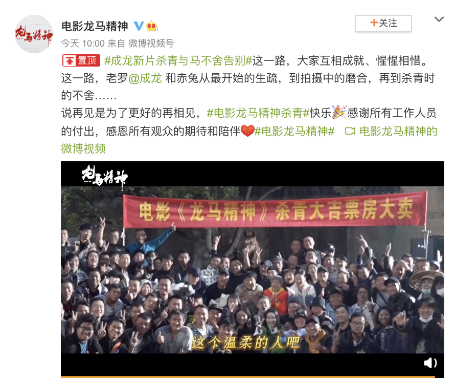 在电影《龙马精神》中,成龙与“赤兔”是相依为命的伙伴,也因此培养出了很深的感情。从电影的杀青短片中可以看得出,成龙与赤兔从最开始的生疏、到拍摄中的磨合、再到杀青时的不舍,一路相处的点点滴滴暖心又感动。