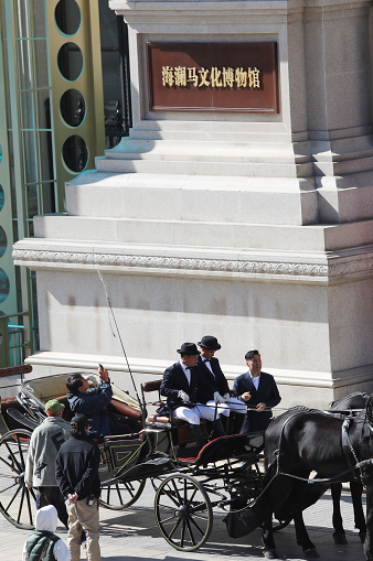 (杀青拍摄间隙,成龙乘坐飞马水城马车,打卡海澜马文化博物馆)