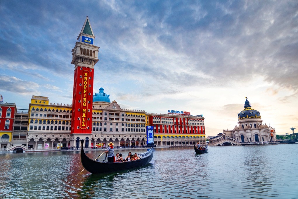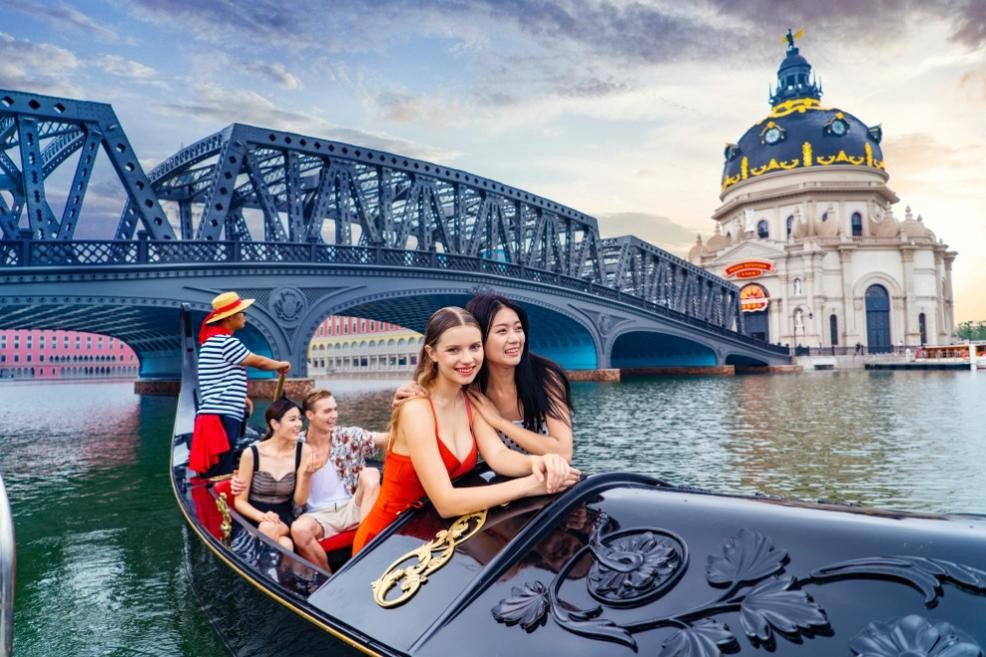 或是沉浸式的深入体验原本只有威尼斯才拥有的贡多拉尖舟,以舟代步,徜徉在蓝天白云与诸多欧式建筑之间。